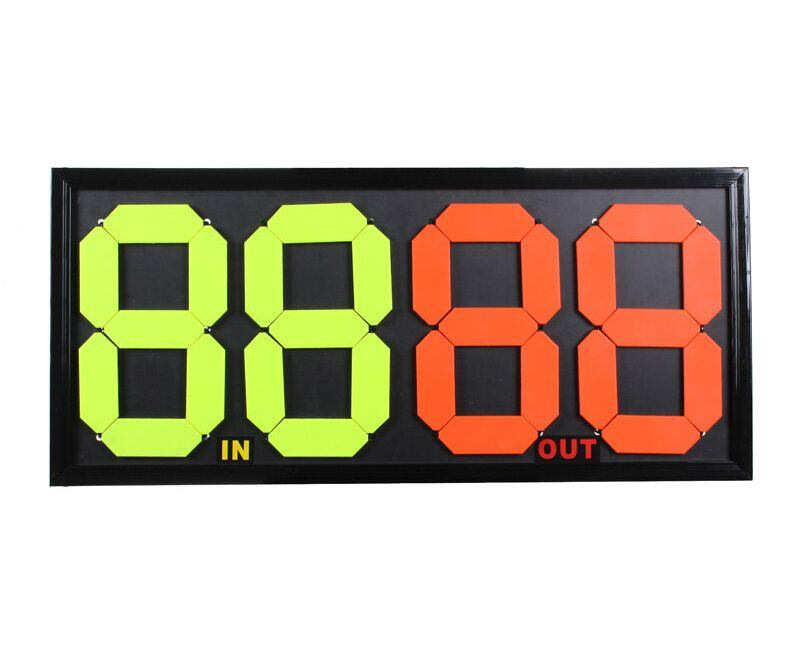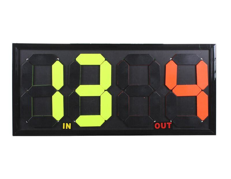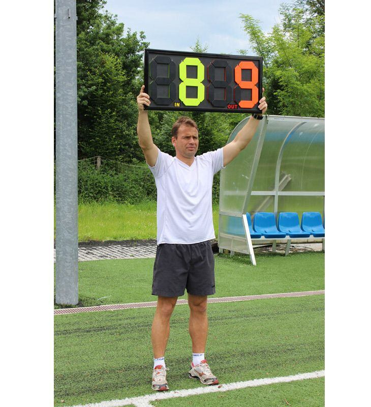 Obojstranná mechanická tabuľa pre striedanie Merco Double je veľmi obľúbená medzi trénermi a futbalovými klubmi. Ovládanie tabule je veľmi jednoduché pomocou systému gumičiek. Výhodou tohto modelu je, že z oboch strán je možné vidieť kto ide do hry a kto von. Číslice sú veľmi dobre viditeľné aj z väčších vzdialeností a to vďaka svetlej žltej a oranžovej farbe. Celkové rozmery ukazovateľa sú približne 84 x 38 x 2 cm. Táto mechanická tabuľa patrí do základných modelov. Ak hľadáte profesionálnejšie tabule pre striedanie, ponúkame aj LED elektronické tabule.