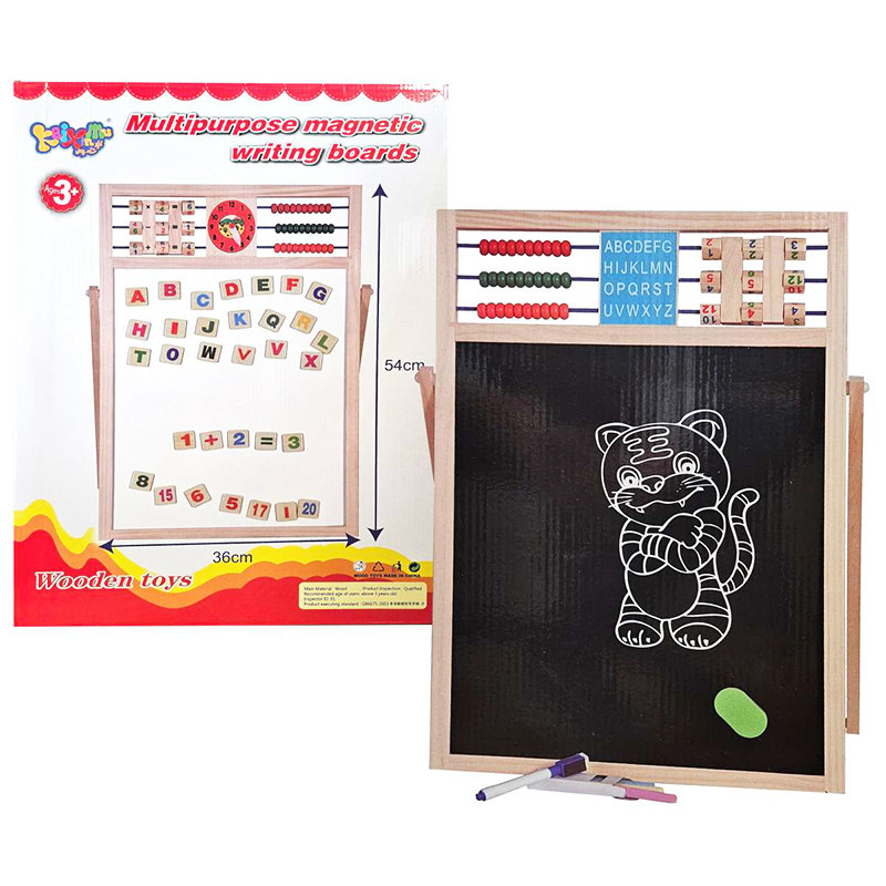 Drevená tabuľa s počítadlom, aby učenie nebola len povinnosť ale aj zábava. Balenie obsahuje obojstrannú tabuľu s počítadlom, hodinami a matematickými príkladmi, tri farebné kriedy, fixu, hubku na utretie tabule, magnetické písmená, číslice a interpunkčné znamienka. Má rozmery 54 x 36 cm. Cena je za kus. Vhodné pre deti vo veku 3+ rokov.