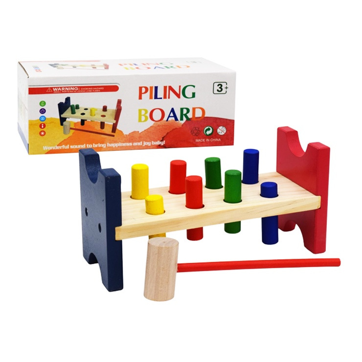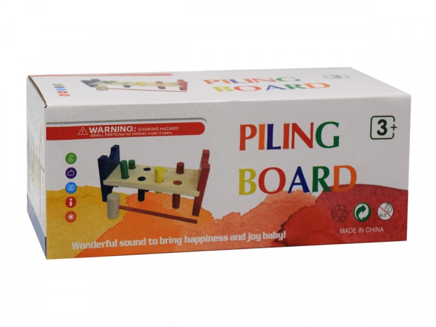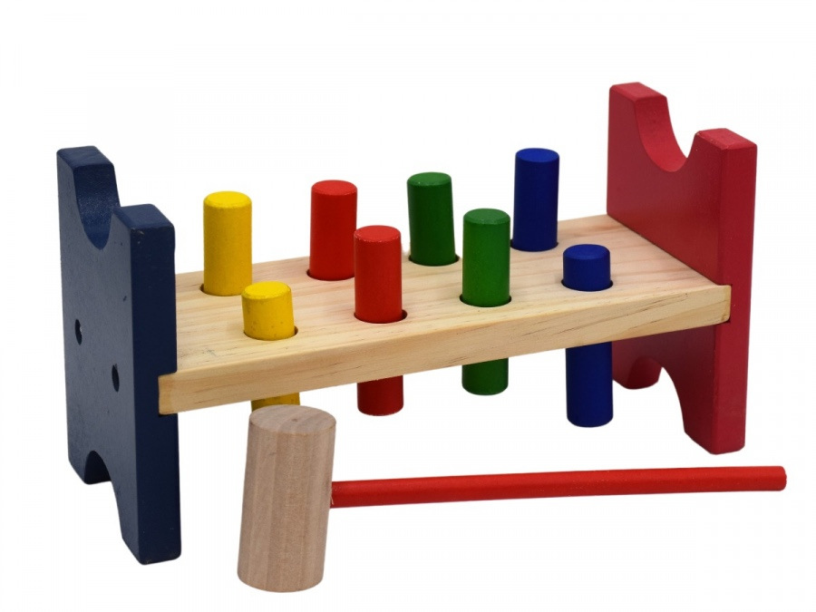 Drevená zatĺkačka s farebnými kolíkmi. Nevhodné pre deti do 3 rokov.