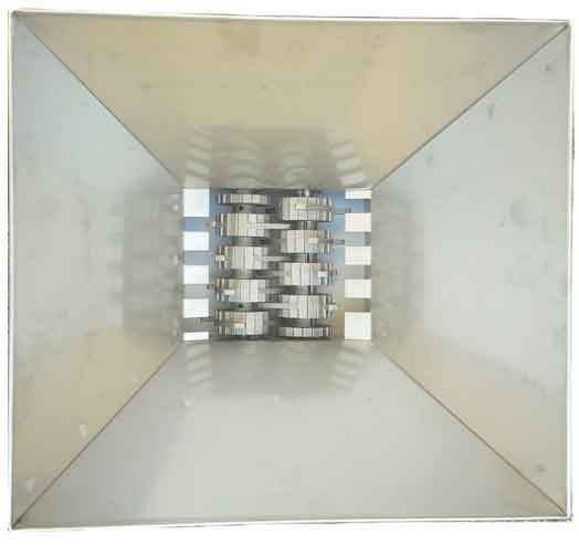 Použité materiály: zásobník z nerezovej ocele, hliníkový drvič, dubový nosník, oceľový rám