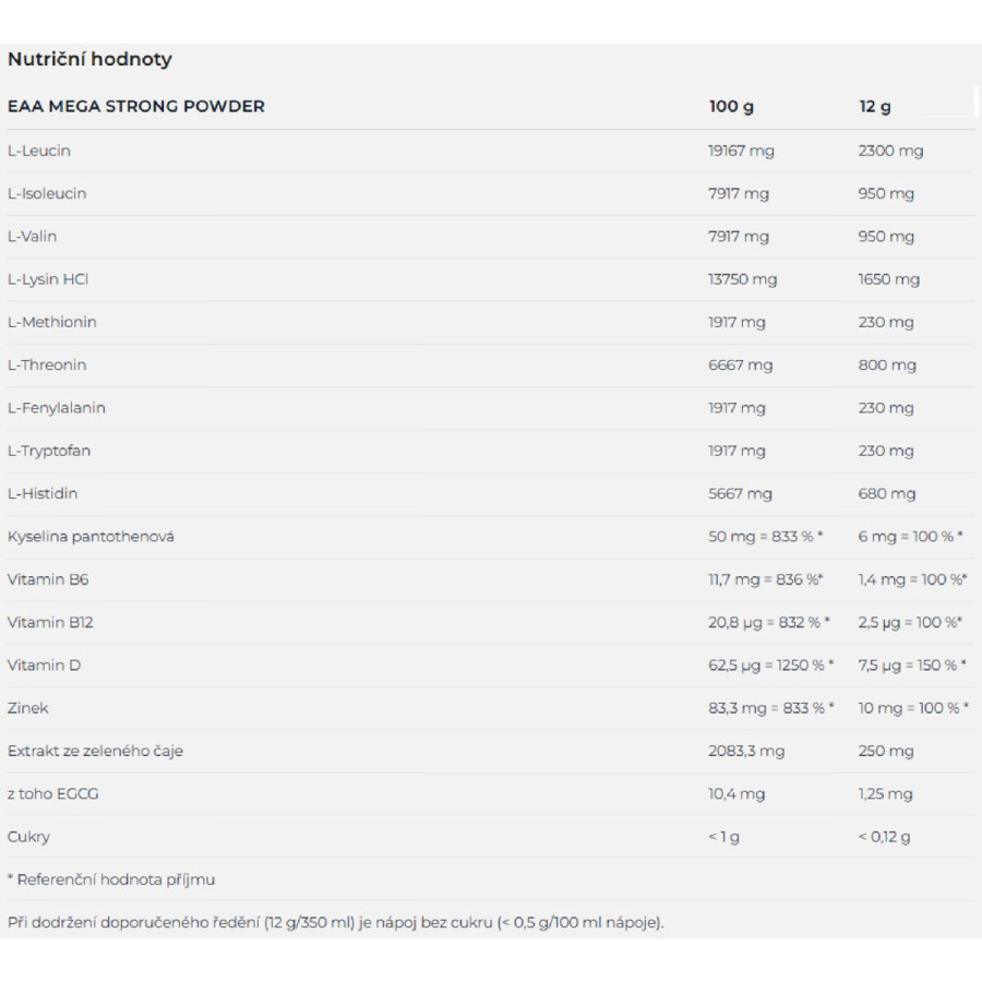 9 esenciálnych aminokyselín v instantnej forme, doplnené o vitamíny, zinok a extrakt zo zeleného čaju. Zmes je špeciálne navrhnutá na podporu optimálnej činnosti svalov, nervovej sústavy a zníženie vyčerpania pri tréningu. Nevyhnutné aminokyseliny si naše telo nedokáže samo vytvoriť, a preto je dôležité ich prijímať zo stravy či doplnkov. Prirodzene ich nájdete napríklad v mäse, mliečnych výrobkoch alebo vajci. Elixírom života je už mnoho rokov nazývaný extrakt zo zeleného čaju. V ľudovom liečiteľstve je vyhľadávaný pre fyzické a psychické povzbudenie, či podporu koncentrácie. Zinok prispieva k normálnej funkcii imunitného systému, syntéze bielkovín a udržaniu normálnych kostí. Podporuje činnosť reprodukčného systému, s obľubou je vyhľadávaný na udržanie normálnych vlasov, nechtov a pokožky. Odporúčané dávkovanie: Rozmiešajte 12 g (cca 1/3 odmerky) v 350 ml vody a po minúte môžete konzumovať. Nápoj vypite maximálne raz denne pred tréningom. Neprekračujte odporúčané dávkovanie. Po namiešaní sú v nápoji zrejmé nerozpustené častice, čo je prirodzenou vlastnosťou výrobku. Upozornenie: Doplnok stravy, so sladidlami. Nenahrádza pestrú stravu. Nie je určené pre deti, tehotné a dojčiace ženy. Neužívať nalačno. Konzumácia s inými výrobkami obsahujúci zelený čaj by nemala presiahnuť 800 mg EGCG za deň. Ukladajte mimo dosahu detí. Chráňte pred teplom, mrazom a vlhkosťou. Dodávateľ: NUTREND D.S., a.s., Chválkovice 604, 779 00 Olomouc, Česká republika