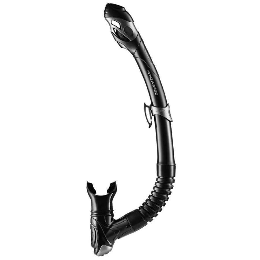 Šnorchel Aqua-Speed Elba ponúka moderný, atraktívny dizajn a rad zaujímavých funkcií. Potápačský šnorchel Elba je vybavený systémom ULTRA DRY, ktorý minimalizuje vniknutiu vody vrchom trubice. Pokiaľ ale predsa len nejaká voda do dýchacej trubice prenikne, zhromažďuje sa v dolnej časti trubice, odkiaľ sa dostane pomocou spodného ventilu určeným práve pre odtok vody. Trubica sama o sebe má veľký priemer a zaručuje prívod veľkého množstva vzduchu a ľahké dýchanie. Flexibilné a anatomicky tvarovaný náustok je vyrobený z vysoko kvalitného silikónu, ktorý je nielen mäkký a príjemný, ale tiež veľmi trvanlivý a zdravotne nezávadný. Silikónový náustok je navyše naklonený v smere úst, čo ešte zvyšuje komfort pri užívaní. Súčasťou šnorchla na potápanie Aqua-Speed Elba je samozrejme aj výškovo nastaviteľná a otočná pracka pre rýchle a pohodlné upevnenie šnorchlu k okuliarom.
