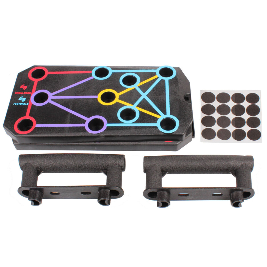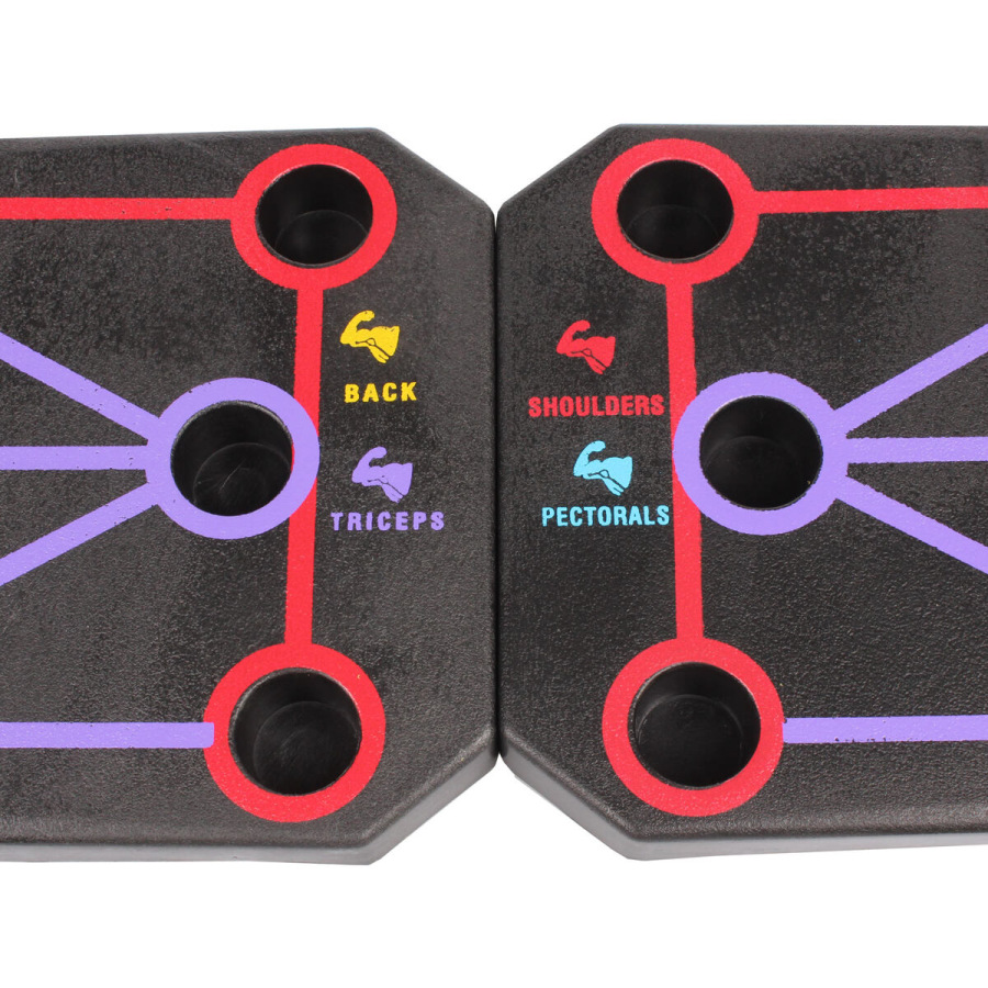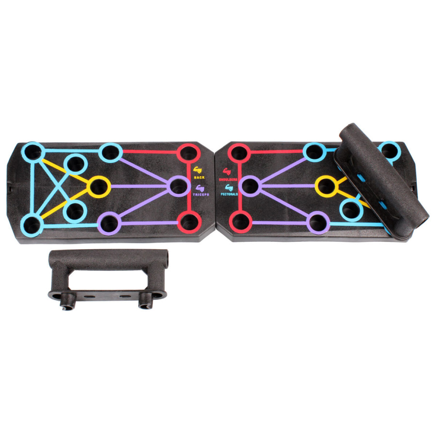 Multifunkčná doska na kľučky Merco Excellent Classic je určená na posilňovanie chrbta, tricepsov, ramien a prsných svalov. Stačí jednoducho nastaviť priložené opierky podľa farebne rozlíšených polôh na doske a môžete začať cvičiť. Skladacia doska aj opierky sú vyrobené z odolného polypropylénu. Tréningová doska Excellent Classic sa skladá z dvoch častí, po zostavení má rozmery 62 x 16 x 2 cm a hmotnosť približne 0,5 kg. Podľa farebne odlíšených pozícií pre madlá posilňujete oblasť, ktorú potrebujete. Ideálny doplnok pre domáce posilňovne. - materiál: PP
