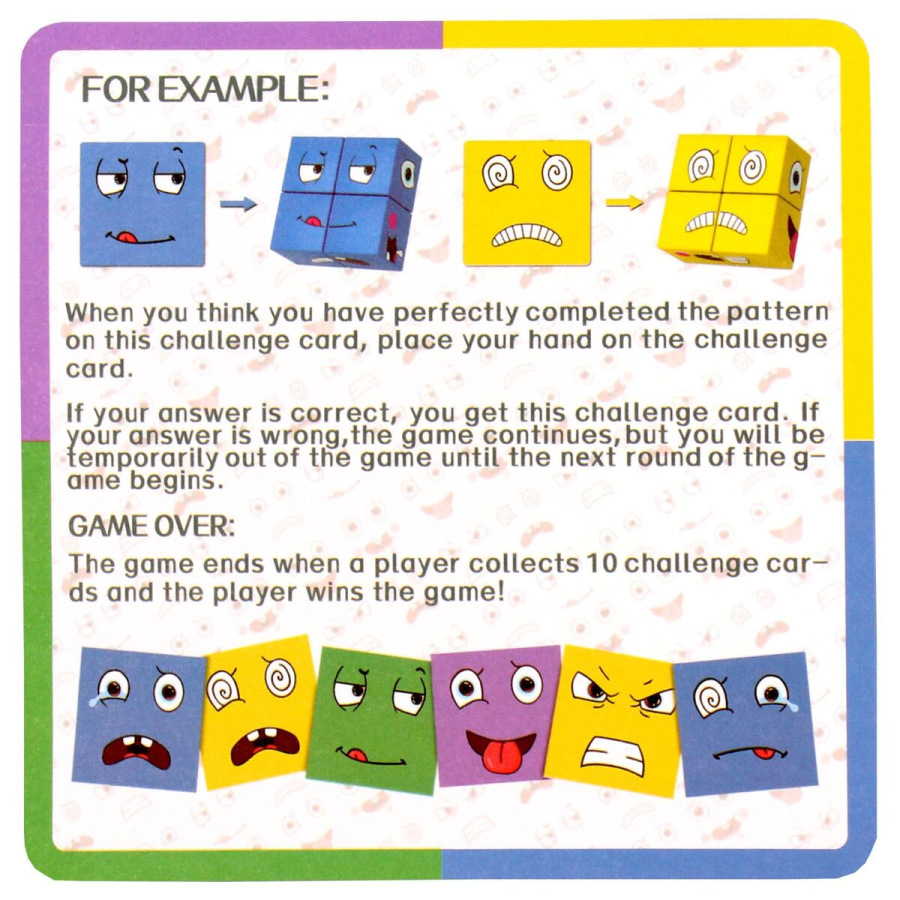 Hra: Začína najmladší hráč a ten otočí jednu tvárovú kartičku. Každý hráč sa snaží čo najrýchlejšie zostaviť zo svojich kociek tvár, ktorá je na kartičke. Prvý, kto si myslí, že má hotovo, zacinká na zvonček. Pokiaľ je jeho tvár naozaj správne zložená, získava kartičku tváre. Avšak pokiaľ je tvár zložená zle, kartička sa zamieša znovu do kôpky kartičiek a hrá sa ďalej. Hráč, ktorý mal tvár zložený zle sa už nesmie toto kolo znova zapojiť, musí počkať až do ďalšieho kola. (Jedno kolo je, pokiaľ sa v otočení kartičky nevystriedajú všetci hráči – max. teda 4 otočenia kartičiek na jedno kolo.)