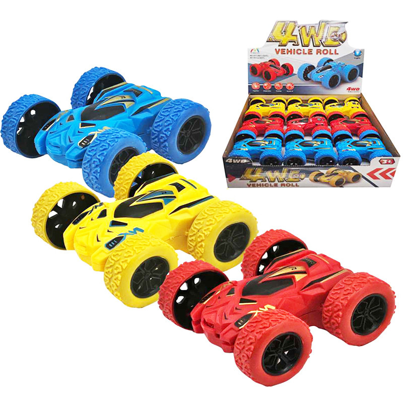 Farebné auto na zotrvačník, zábavná hračka, ktorá sa pri náraze otočí o 180° a pokračuje v jazde ďalej. Na výber sú tri farebné varianty. Má rozmery 8,5×8 cm. Balené v boxe po 9 ks. Cena je za kus. Vhodné pre deti vo veku 3+ rokov.