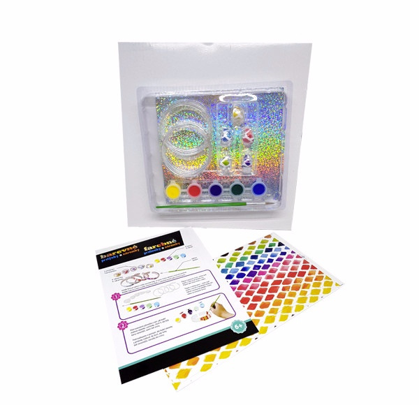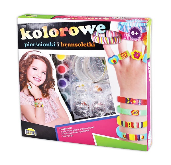 Farebné prstienky a náramky. V balení nájdete 5 prstienkov, 4 náramky, 5 farieb, štetec a návod. Veselú tvorivú zábavu.
