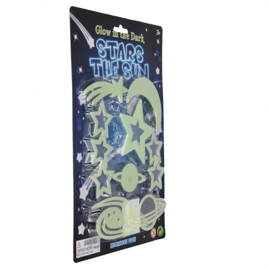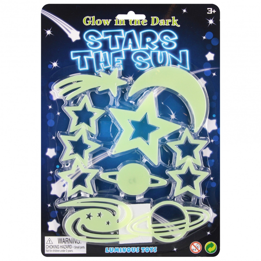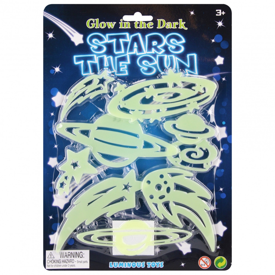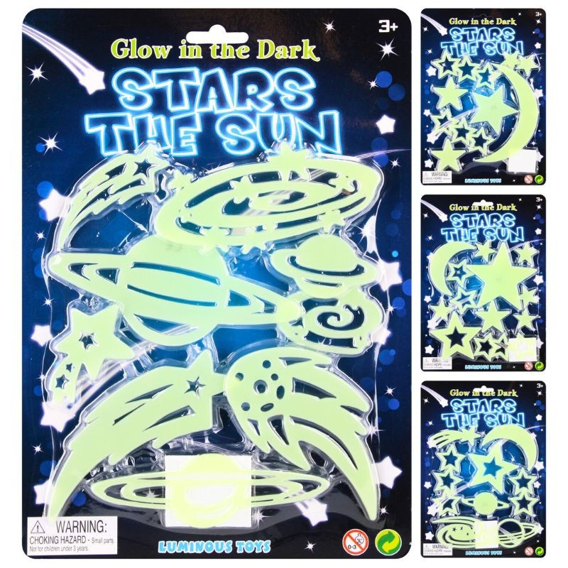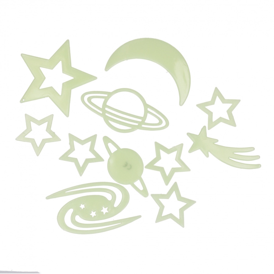 Fluorescenčné vesmírne dekorácie krásne žiaria v tme a premenia každú detskú izbu na malý vesmír. Ideálne na stenu alebo strop, reagujú aj na UV svetlo. Mix vzorov – planéty, hviezdy a ďalšie tvary. Jednoduché nalepenie. Určené pre deti od 3 rokov. Cena za kus.