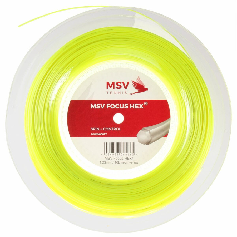 Už niekoľko rokov najobľúbenejší a najpredávanejší výplet z radu MSV a to najmä pre svoj šesťhranný profil a stálosť napätia, významnú úlohu zohráva aj cena, ktorá je oproti iným značkám výpletov v rovnakej kvalite polovičná až tretinová. Vo všetkých vlastnostiach najlepšie na nemeckom Saitenforum.de (Životnosť, Sila, Kontrola, Cit, Komfort, Spin, Stabilita napätia). Celková spokojnosť testujúcich hráčov 91% (39/43 testerov). CoPoly výplet novej generácie, HEXagonálny profil struny (šesťuholník). Veľmi dobrá trvanlivosť strún. Výplet ponúka stále napätie a dlhodobý výkon. MSV Focus HEX stráca po 30-tich dňoch a mnohých hodinách usilovnej hry iba 13% zo svojho napätia. Veľkou výhodou je potenciál pre spinové údery. Hráči ho opisujú ako "najlepší výplet na spinové údery", a to vo všetkých jeho priemeroch. Hra s týmto výpletom je navyše veľmi pohodlná.