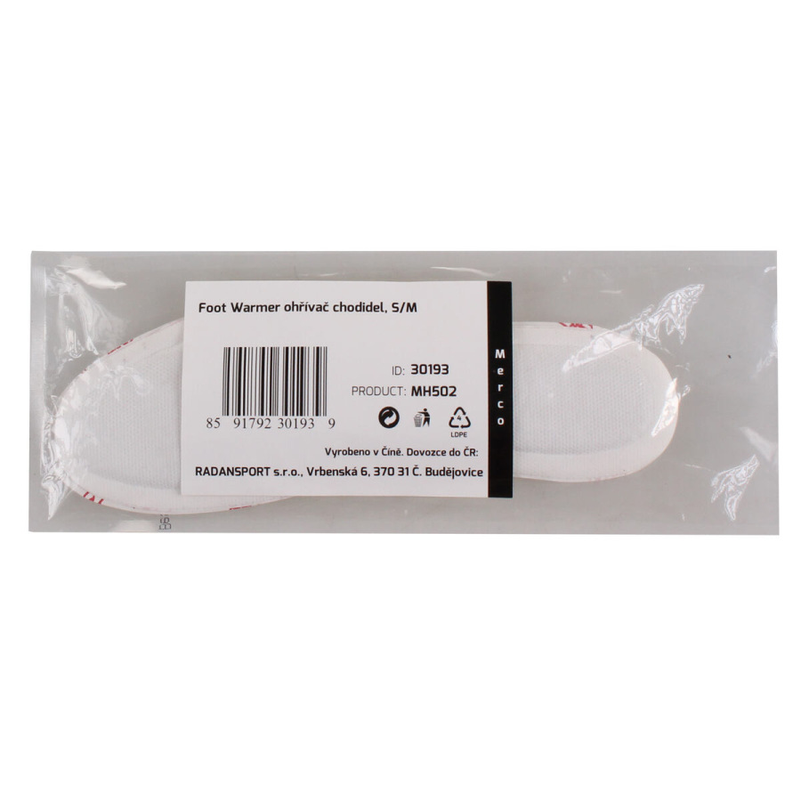 Jednorazové vyhrievacie vložky do topánok Merco Foot Warmer zaistia teplo všetkým, ktorí trpia na studené nohy. Vyhrievacie vložky Merco Foot Warmer sú plnené biologicky rozložiteľnou (biodegradabilnou) zmesou, u ktorej pri vystavení vzduchu dôjde k oxidačnému procesu, ktorý vytvára teplo. V prípade týchto vložiek je maximálna teplota 45°C a priemerná teplota 38°C. Stačí vybrať vložky z vákuového balenia, vyčkať cca dve minúty na maximálnu teplotu, vložky nalepiť do topánok, a potom už si môžete vychutnávať až šesť hodín príjemného tepla. Nikdy ale neumiestňujte ohrievač chodidiel Merco Foot Warmer priamo na holú pokožku a v prípade zdravotných problémov, radšej pred použitím konzultujte jeho užívanie s Vaším lekárom. Jednorazové ohrievače obuvi Merco Foot Warmer ponúkame vždy v párovej dĺžke: