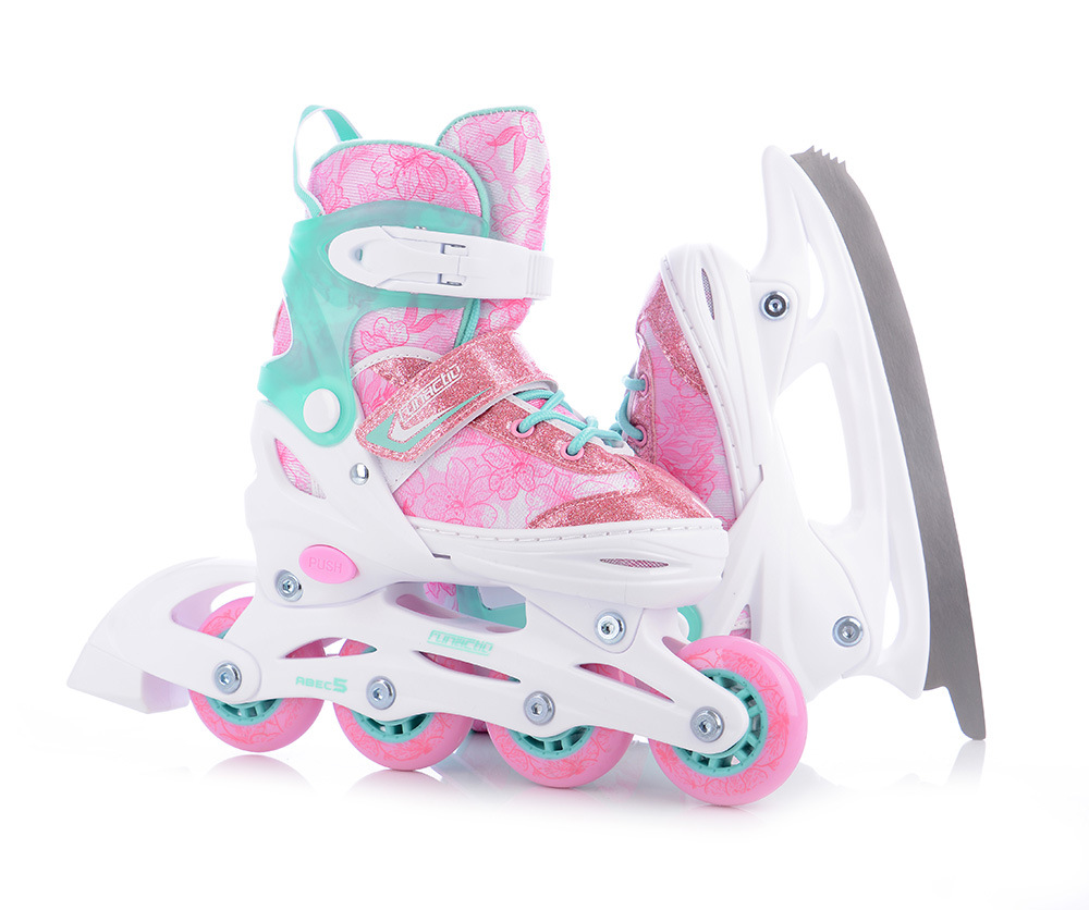 FunActiv TRILO 4in1 GIRL sú univerzálne rozťahovacie detské korčule, ktoré vďaka chytrej konštrukcii ponúknu hneď štyri rôzne varianty použitia. Jediný model tak deťom umožní korčuľovať na ľade, jazdiť na inline, učiť sa stabilitu na širokom podvozku a vyskúšať aj štýl jazdy na quad kolieskových korčuliach – bez nutnosti kupovať viac párov.