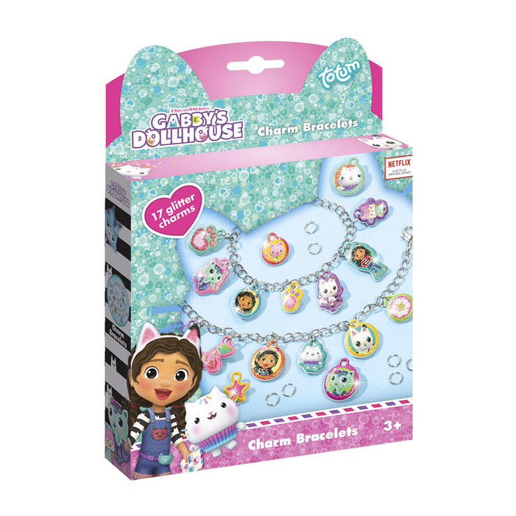 Gabby výroba náramkov s príveskami, vyrobte si vlastné náramky s plastickými príveskami. Balenie obsahuje 34 plastických samolepiek s trblietkami, 2 retiazkové náramky, kovové krúžky a návod. Rozmery balenia sú 17,5 x 24,5 x 3,5 cm.