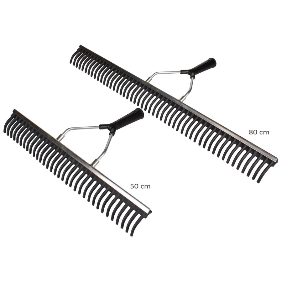 Hrable určené pre šetrné odstránenie opadaného lístia alebo odpadkov z tenisových kurtov. Vyrobené z kvalitnej gumy, ocele a PVC. Pri použití týchto hrablí nedochádza k narušeniu samotného povrchu ihriska a to tak zostane nepoškodené. Hrable ponúkame v dvoch šírkach (50 a 75cm). Dodávané sú iba samostatné hrable bez násady.