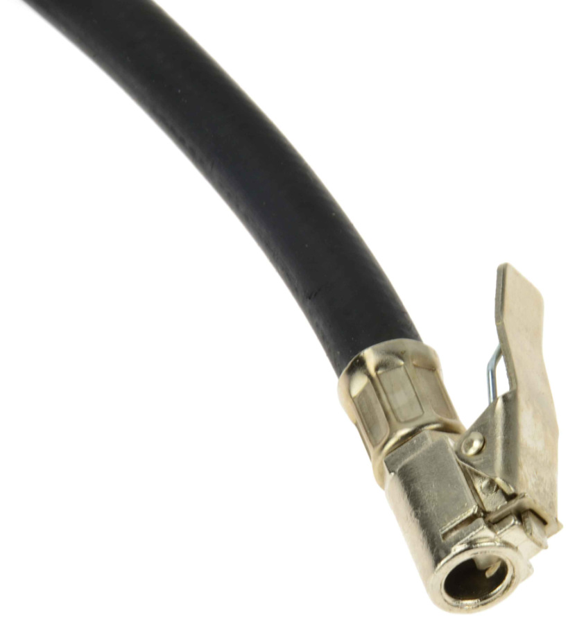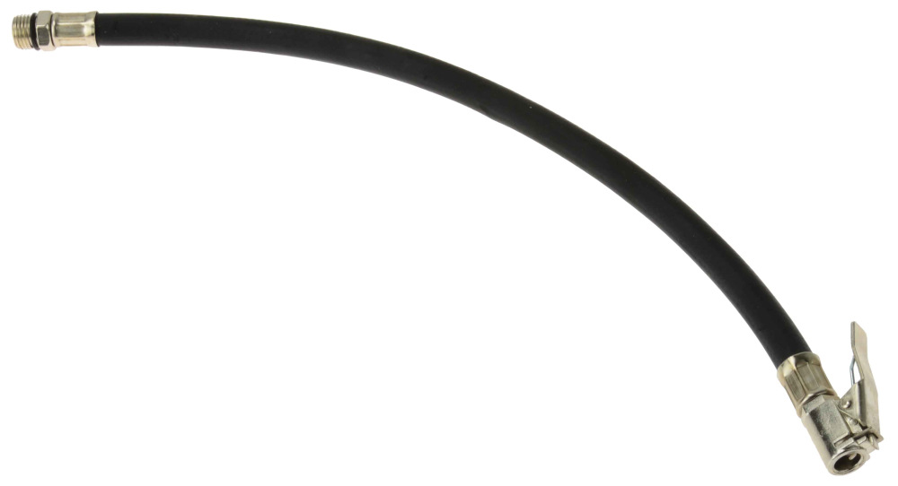 Flexibilná gumená vzduchová hadica s kovovým skľučovadlom a závitovou spojkou.