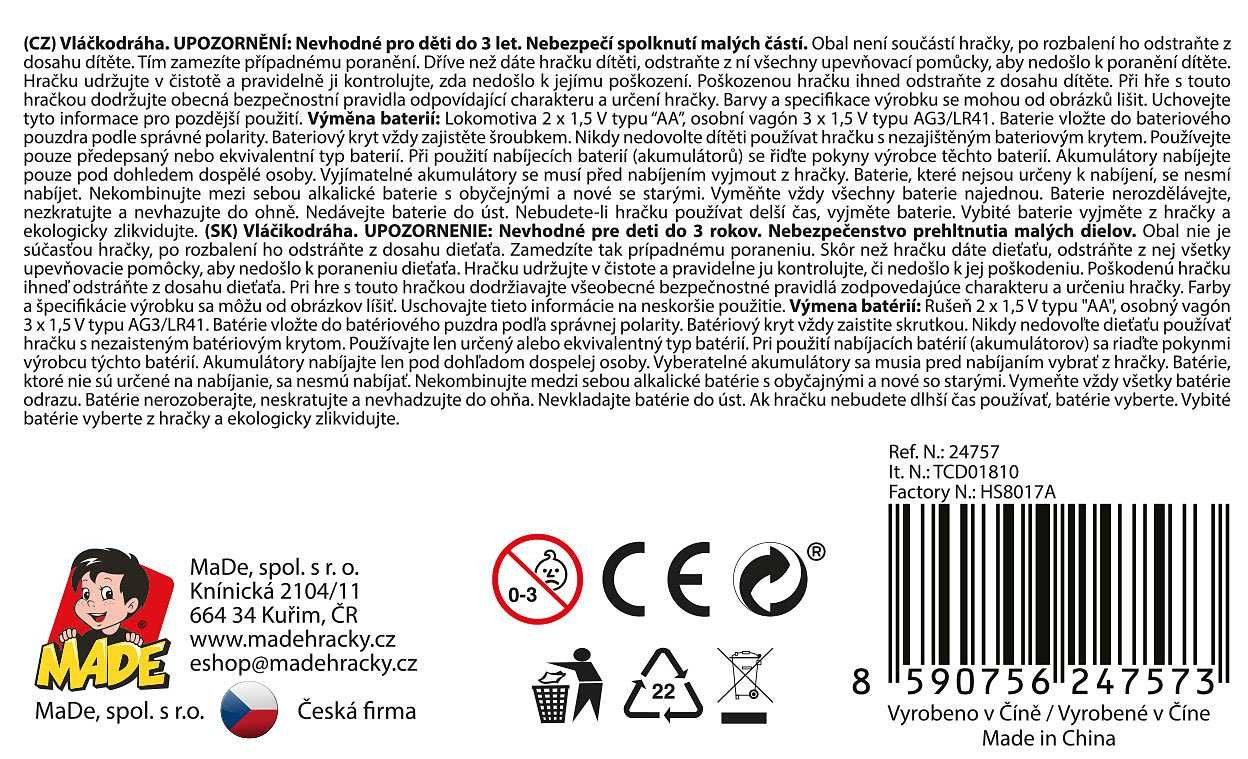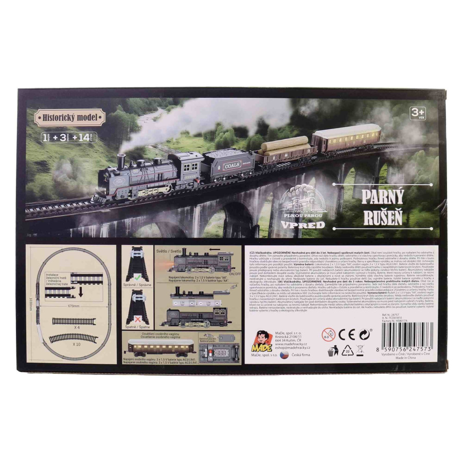 Táto vlaková súprava je ideálnou hračkou pre malých chlapcov od 3 rokov. S rozmermi 103x67 cm ponúka dostatok priestoru na kreatívne hranie. Súprava obsahuje plastové vlaky a doplnky, ktoré sú bezpečné pre deti. S možnosťou napájania batériami typu AA alebo AG13 je zaručené dlhé a zábavné hranie. Vhodné pre malých železničiarov, ktorí si radi stavajú vlastné trate a prežívajú dobrodružstvo na koľajniciach. Táto vlaková súprava je skvelým darčekom pre malých nadšencov do železníc.