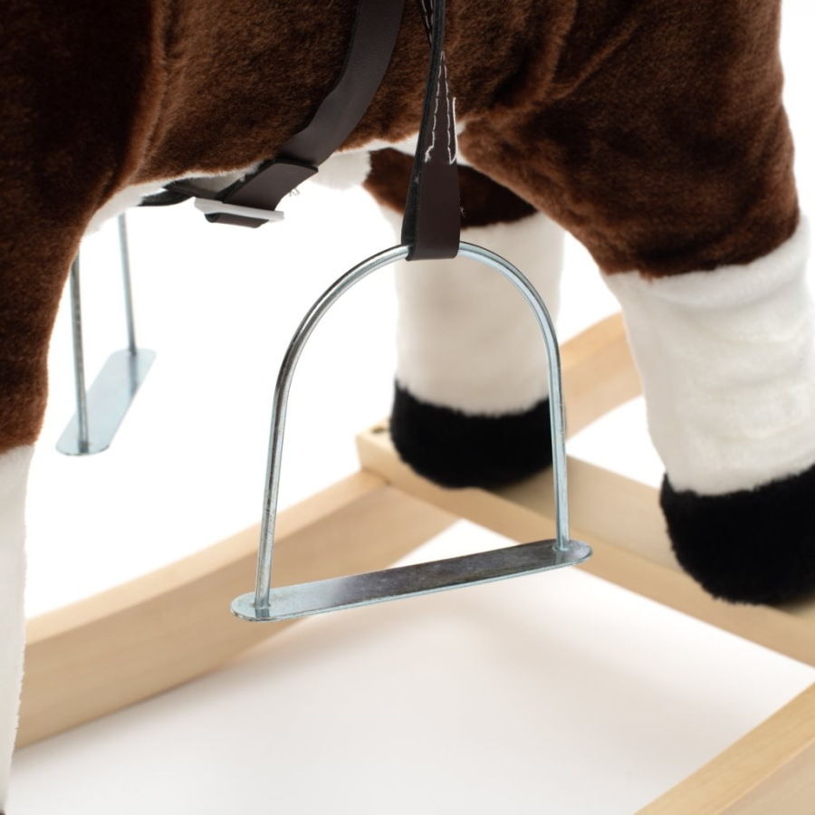 Mäkučký hojdací koník Baby Mix bol navrhnutý pre deti, ktoré majú rady dobrodružstvo. Vyzerá ako skutočný, takže sa vaše dieťa bude cítiť ako skutočný jazdec. Koník je vyrobený z mäkkého plyšu, okolo krku má ozdobnú šatku a je vybavený drevenými hojdacími lištami, ktorých profil chráni dieťa pred prevrátením. Pohodlné sedlo, pevná uzda, kovové strmene, drevené rukoväte a stabilné hojdacie lišty zaistia vašim kovbojom ešte väčšiu stabilitu a pohodlie počas hojdania. Je vyrobený z mäkkého plyšového materiálu, pevné drevené lišty alebo rukoväte je možné ľahko odskrutkovať. Po stlačení tlačidiel na uškách koník vrtí chvostíkom, hýbe tlamičkou, ozvú sa zvuky cvalu, koník zaerdží a zaspieva kovbojskú pesničku. Tri potrebné batérie AA 1,5 V sa vkladajú do púzdra umiestneného na brušku koníka a nie sú súčasťou balenia. Počas hojdania sa dieťa učí koordinovať pohyby svojho tela s koníkom, čo zlepšuje celkovú rovnováhu a motoriku dieťaťa.