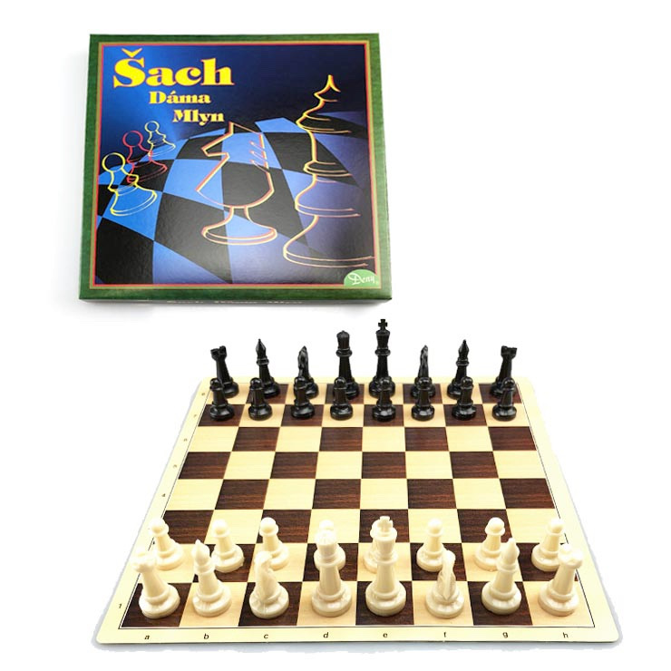 V balení nájdete Šach a Dámu s plastovými figúrkami a hracími plánmi.