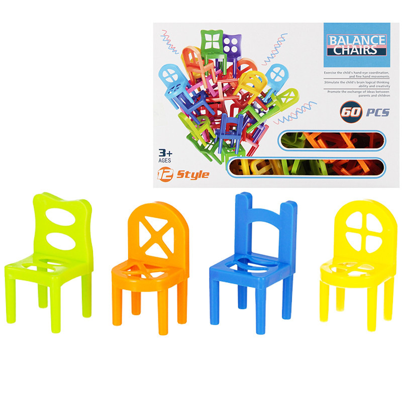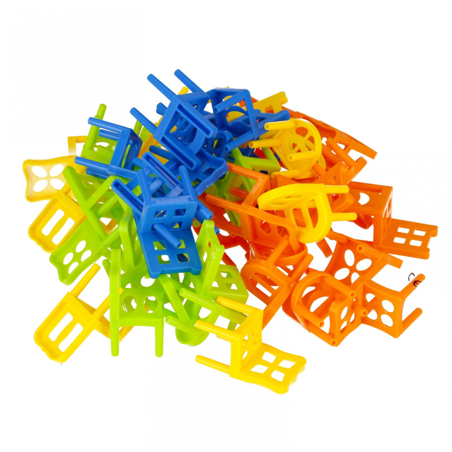 Hra Stoličky, každý hráč pridá k konštrukcii stoličku a snaží sa zabrániť jej prevráteniu. Sada obsahuje 60 plastových stoličiek. Má rozmery 25x17x7 cm. Cena je za sadu. Vhodné pre deti vo veku 3+ rokov.