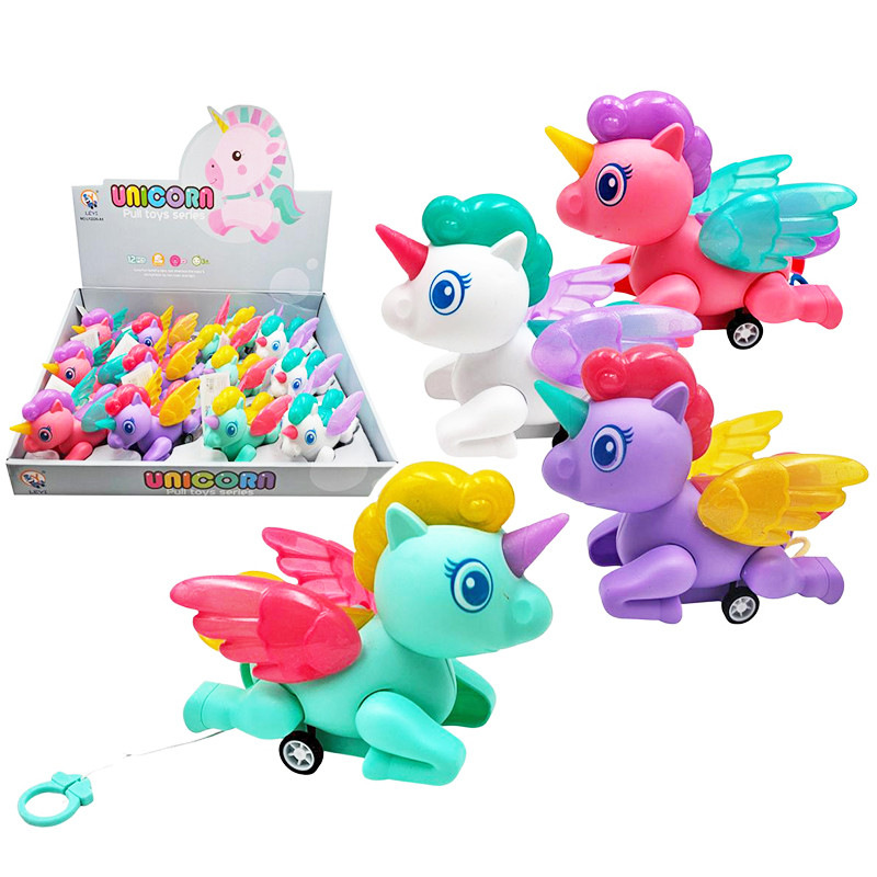 Jednorožec na kolieskach, hračka, ktorú môžu deti natiahnuť a sledovať, ako sa veselo pohybuje. Na výber zo štyroch farieb. Má rozmery 9×11 cm. Balené v boxe po 12 ks. Cena je za kus. Vhodné pre deti vo veku 3+ rokov.