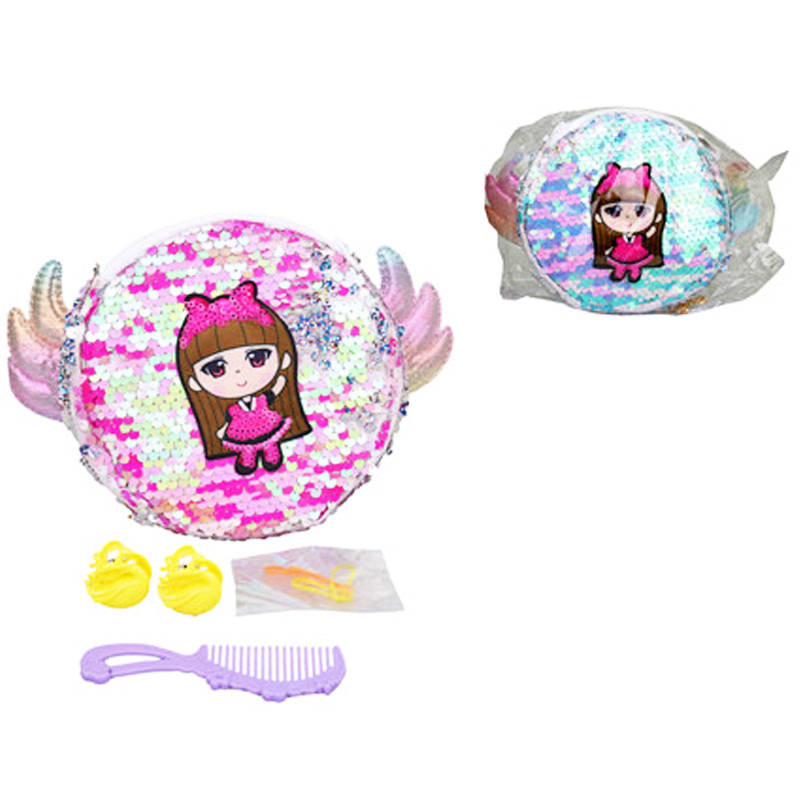 Kabelka kozmetická, je v tvare kruhu s priemerom 15 cm so zipsovým zatváraním a dlhou retiazkou na zavesenie na rameno. Kabelka obsahuje drobné doplnky na úpravu vlasov. V ponuke je v 2 prevedeniach, cena je za kus. Vhodné pre deti 3+.