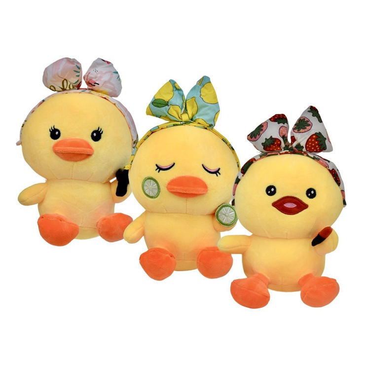 Plyšová 25cm sediaca kačička s mašličkou a vyšitými očkami. Možnosť výberu z troch druhov mašličky - s jahôdkami, s pelikánmi alebo s citrónami.
