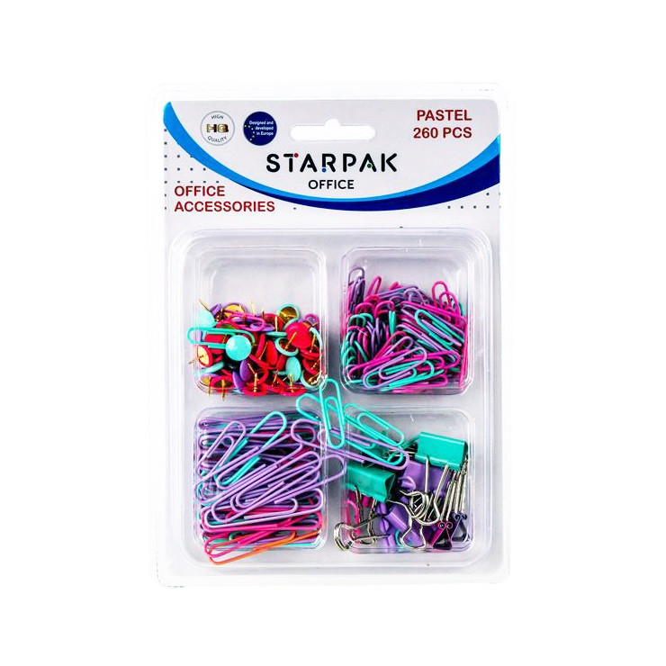 Každá sada obsahuje kancelárske sponky, štipce na tabuľu, gumičky a modré alebo zelené sponky. Rozmery balenia (D x V x H) (cm) 16x21x4. Balené na blistri.