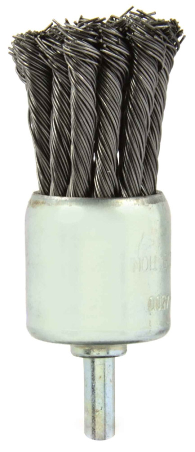 Oceľový hrnčekový kartáč vrkočový 28 mm so stopkou. Ideálny na renovačné práce, čistenie kovových povrchov, odstraňovanie starých farieb, lakov, hrdze, otrepov atď.