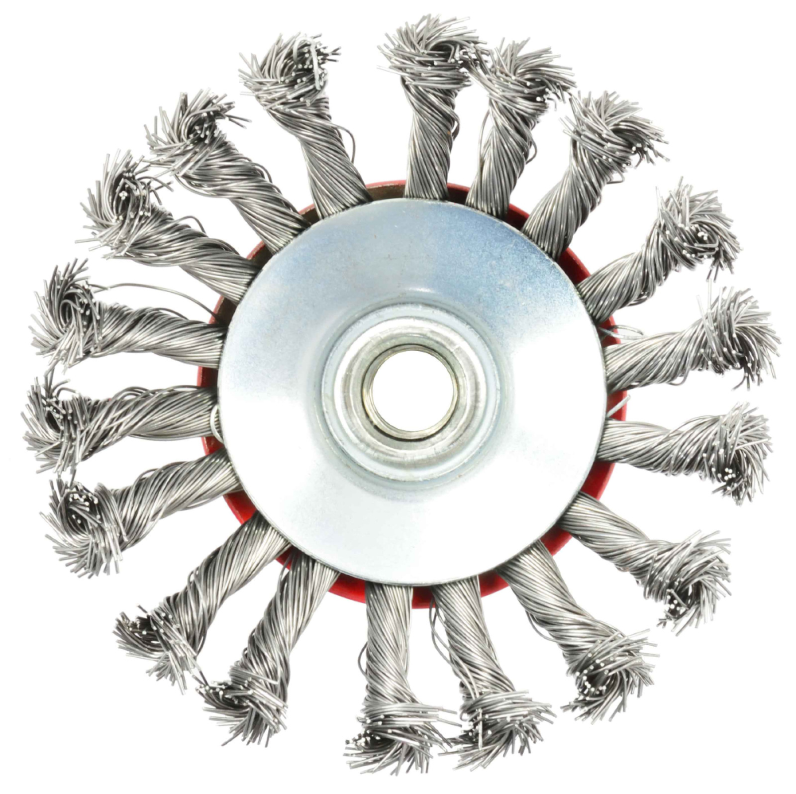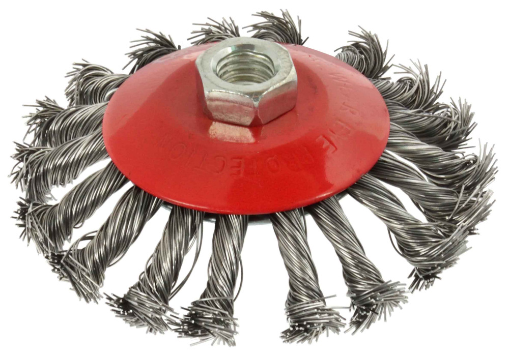 Oceľový miskový kartáč vrkočový 115 mm / 3 "M14. Ideálny na renovačné práce, čistenie kovových povrchov, odstraňovanie starých farieb, lakov, hrdze, otrepov atď.