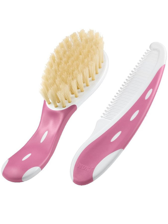 Kefka a hrebienok Nuk. Kefka na vlasy z jemného prírodného vlákna s hrebienkom. Kefka jemne masíruje pokožku hlavy bábätka, a tak podporuje prekrvenie pokožky a posilňuje vlasy a upravuje ich. Hrebienok má zaoblené okraje, čo uľahčuje starostlivosť o dieťa. Protišmyková rukoväť zaručí pohodlné držanie hrebienku aj kefky. Vhodné pre deti od narodenia.