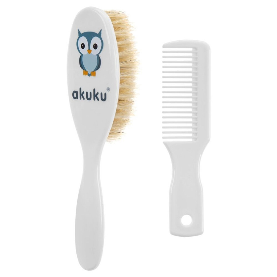 Kefka a hrebienok s prírodným vlasom Akuku. Vyrobené bez BPA. Rozmery: hrebienok: cca 11 cm, kefka: cca 15 cm. Vhodné pre deti od narodenia.