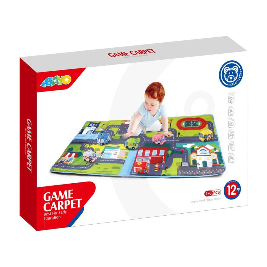 Koberček na hranie Bayo je nádherný koberček s motívom mesta s nádherne vykreslenými cestami, semafómi, kruhovým objazdom a budovami. Koberček dopĺňa 6 mäkých vankúšikových autíčok - požiarnici, polícia, autobus, .... Pri hraní na koberčeku si dieťa trénuje pohybové schopnosti, jemnú motoriku a rozvíja hmat. Je vhodný pre deti od 12 mesiacov. Koberček chráni od chladnej podlahy a má rozmery 80x158 cm.
