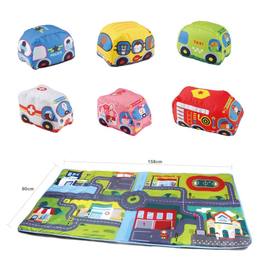 Koberček na hranie Bayo je nádherný koberček s motívom mesta s nádherne vykreslenými cestami, semafómi, kruhovým objazdom a budovami. Koberček dopĺňa 6 mäkých vankúšikových autíčok - požiarnici, polícia, autobus, .... Pri hraní na koberčeku si dieťa trénuje pohybové schopnosti, jemnú motoriku a rozvíja hmat. Je vhodný pre deti od 12 mesiacov. Koberček chráni od chladnej podlahy a má rozmery 80x158 cm.