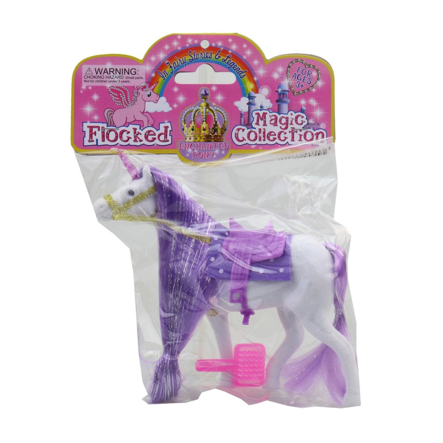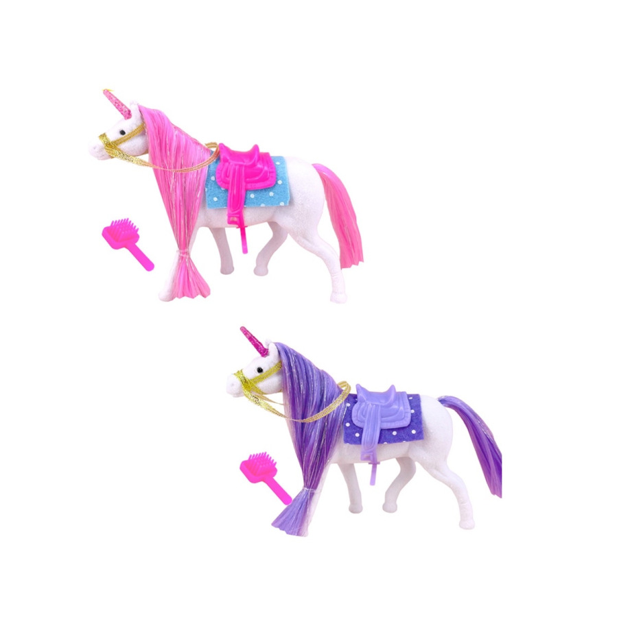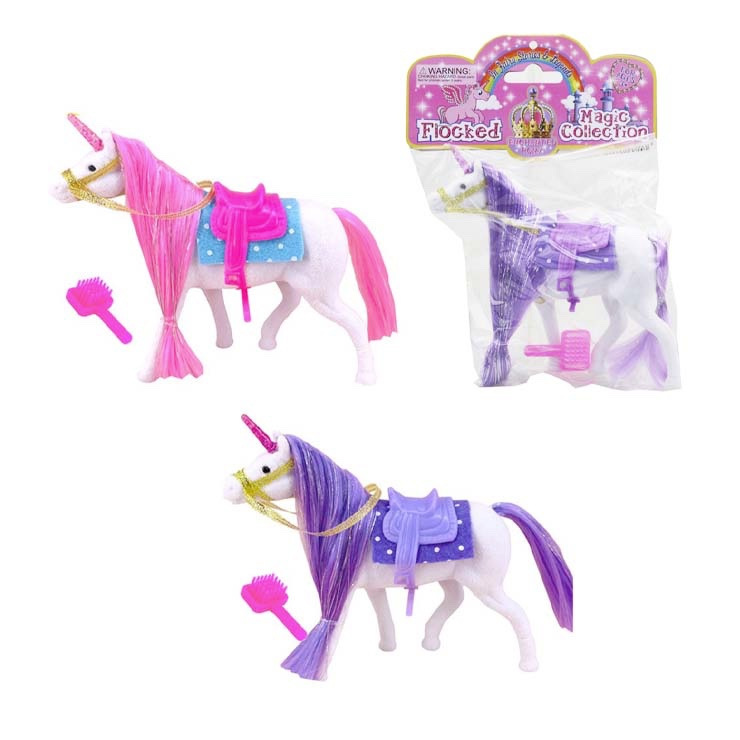 Kôň jednorožec so štetcom, uzdou, sedlom a sedlovou podložkou.