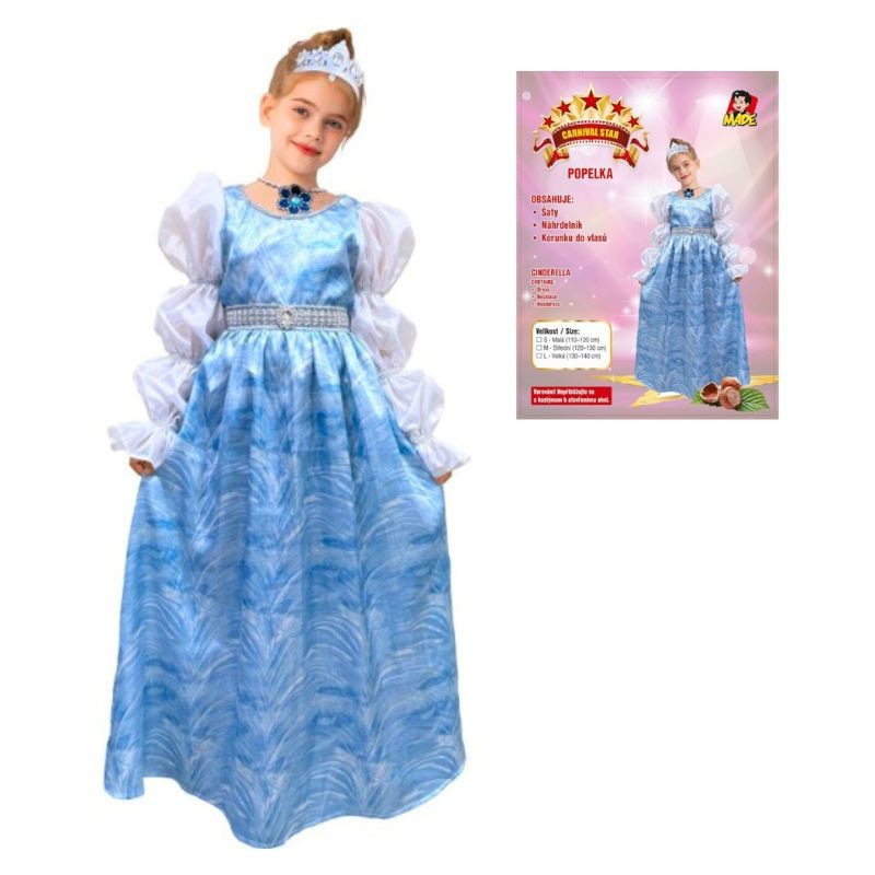 Karnevalový kostým Popolušky pre deti, vhodný na karnevaly a rozprávkové oslavy. Balenie obsahuje šaty, náhrdelník a korunku do vlasov. Určené pre deti s výškou 110–120 cm.