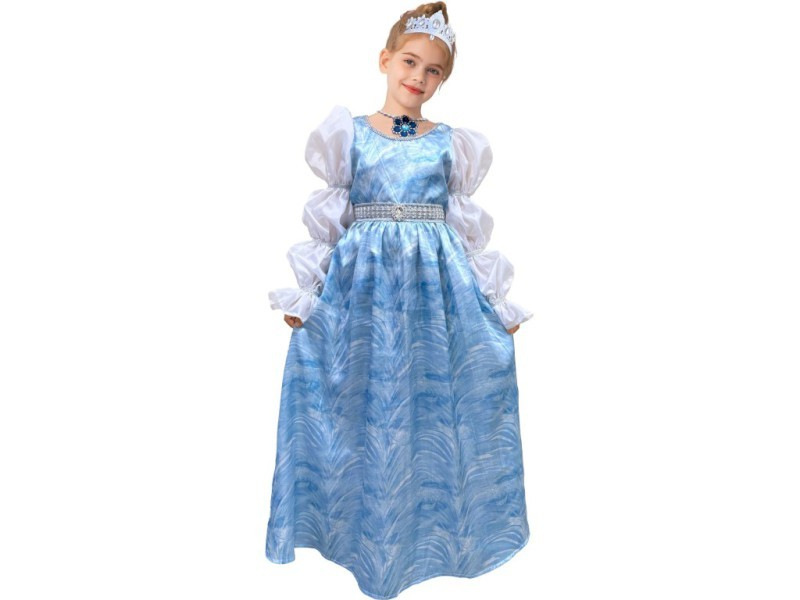 Karnevalový kostým Popolušky pre deti, vhodný na karnevaly a tematické akcie. Balenie obsahuje šaty, náhrdelník a korunku do vlasov. Určené pre deti s výškou 130–140 cm.