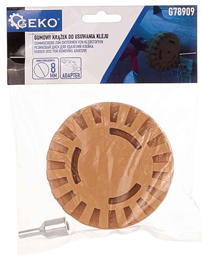 Kotúč gumový so zárezmi, stopka 8 mm na odstraňovanie nálepiek a lepidla + adaptér, GEKO