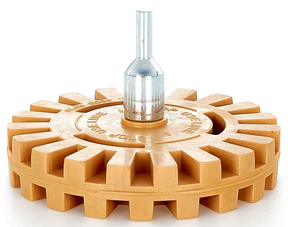Gumový kotúč (so zárezmi) s priemerom 100mm umožňuje jednoducho, efektívne a rýchlo odstrániť zvyšky lepidla. Je perfektný na odstraňovanie zvyškov lepidla z vyvažovacích závaží kolies a zvyškov lepidla upevňujúcich lišty ku karosérii auta.