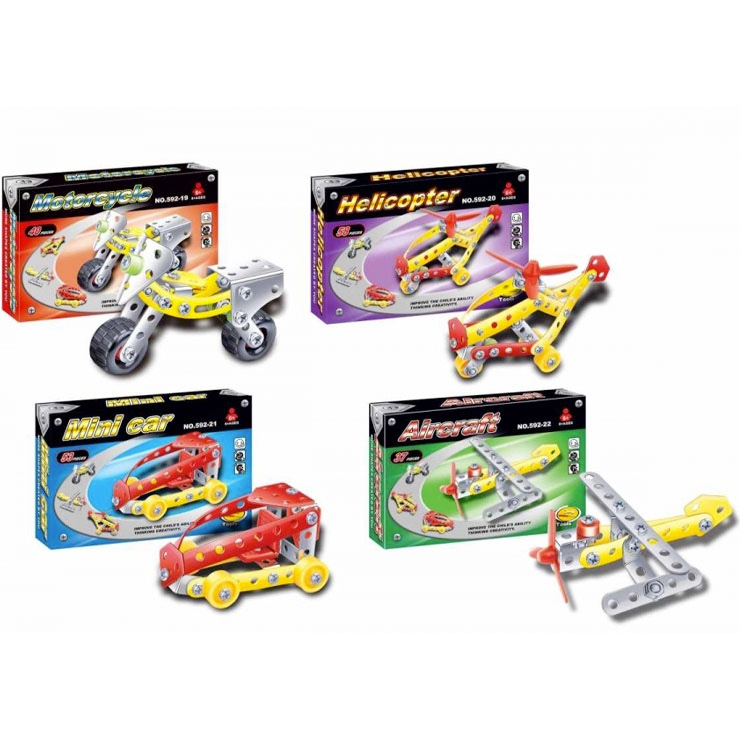 Kovová mini skladačka. Možnosť výberu zo štyroch druhov a to lietadlo, vrtulník, auto alebo motorka. Nevhodné pre deti do 3 rokov.