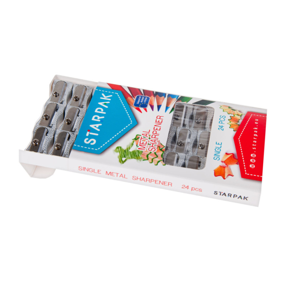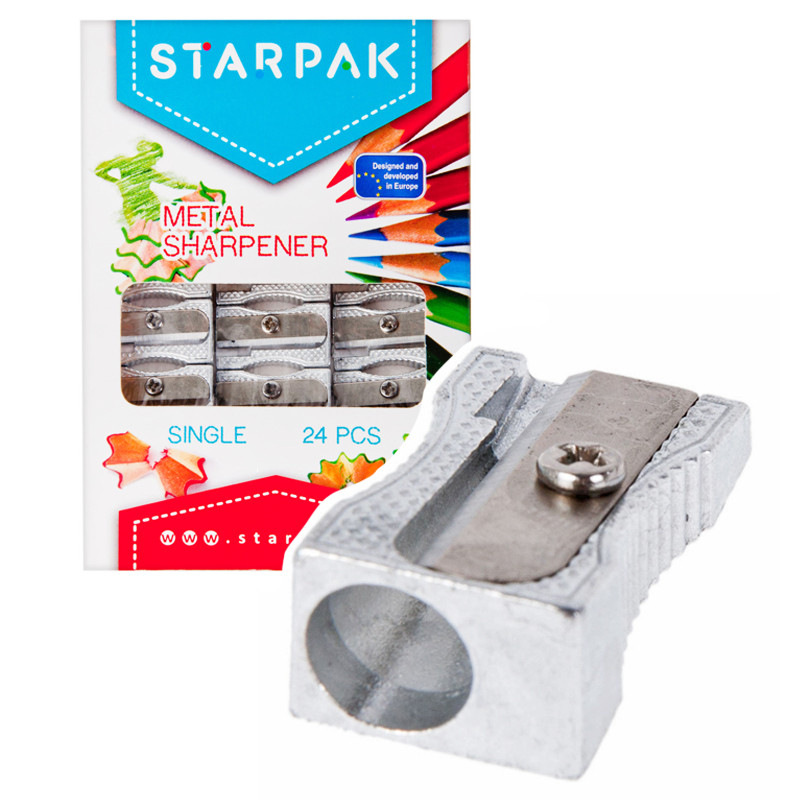 Kovové strúhadlo, obal má rozmer 1x8x11cm. Balené po 24 kusoch. Cena je za 1 kus. Vhodné pre deti 3+.