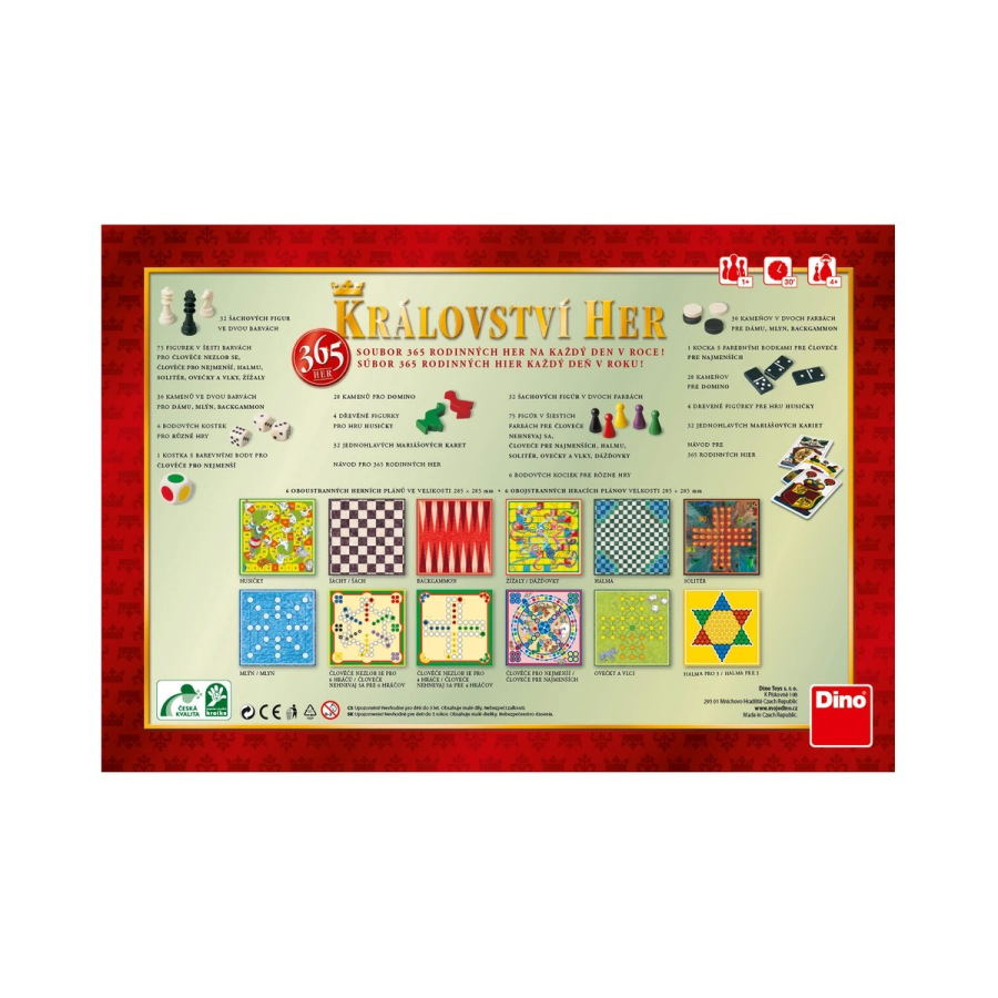 Kráľovstvo hier – 365 hier je rozsiahly rodinný súbor obsahujúci klasické aj menej známe doskové, kartové a kockové hry v jednom balení. Nájdete tu herné plány, karty, kocky, figúrky aj pravidlá k jednotlivým hrám, takže si môžete zahrať inú hru takmer každý deň v roku. Súbor je určený pre 1 a viac hráčov, pričom dĺžka hry sa líši podľa vybraného variantu cca 15–60 minút.