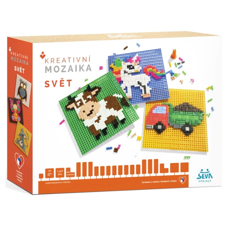 Stavebnica mozaikového typu SEVA Mozaika - Svet je nielen skvelá hračka, ale aj pomôcka na cvičenie jemnej motoriky vašich detí. Okrem motoriky si deti budú zlepšovať predstavivosť a tvorivosť. Základom stavebnice je plastová mriežka, do ktorej sa vmačkávajú dieliky podľa fantázie alebo predlohy. Plastové mriežky sa dajú navyše spájať, takže si môžete vytvoriť neobmedzene veľké plátno pre vašu mozaiku! Všetky stavebnice Mosaic Color sú vzájomne plne kompatibilné, takže ju môžete neustále rozširovať a dopĺňať o nové dieliky.