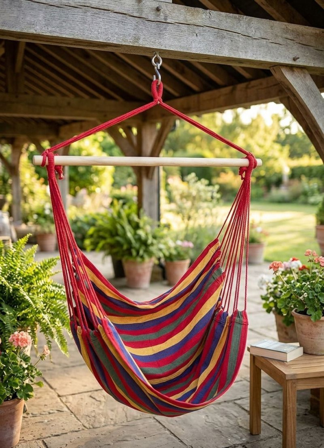 Závesné hojdacie kreslo je vyrobené z príjemného bavlneného materiálu, vďaka čomu poskytuje ideálne miesto na oddych. Celá sedacia časť je zavesená na pevnej drevenej tyči. Kreslo má nosnosť 150 kg a jeho rozmery sú 100 x 50 cm. Kreslo je vhodné pre vonkajšie aj vnútorné použitie. Kovový krúžok je potrebný pre zavesenie kresla na dopredu navŕtaný hák. Uistite sa, že konštrukcia, na ktorú kreslo umiestnite, je pevná a bezpečná. Nie je vhodné vystavovať kreslo väčšej záťaži. Kreslo je multifarebné.