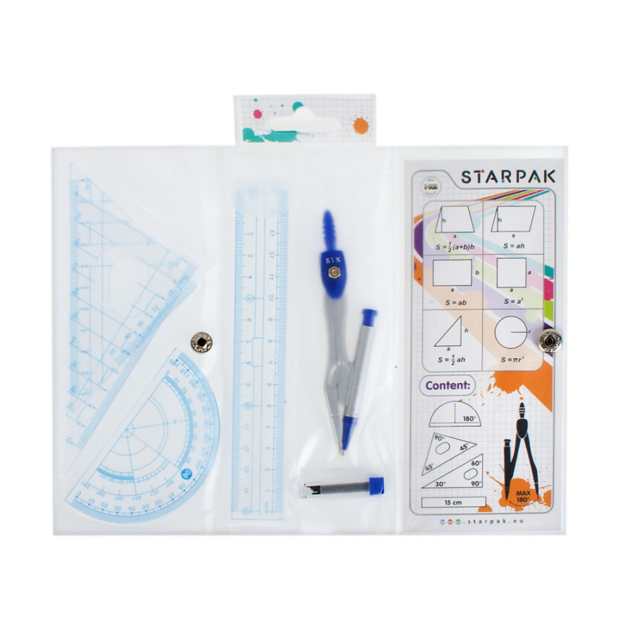 Kružidlo a pravítka sada, má rozmery 21x8x1cm. Sada obsahuje kružidlo s mechanickou ceruzkou, pravítko, 2 štvorčeky, náhradné tuhy a uhlomer. Cena je za 1 sadu. Vhodné pre deti 3+.