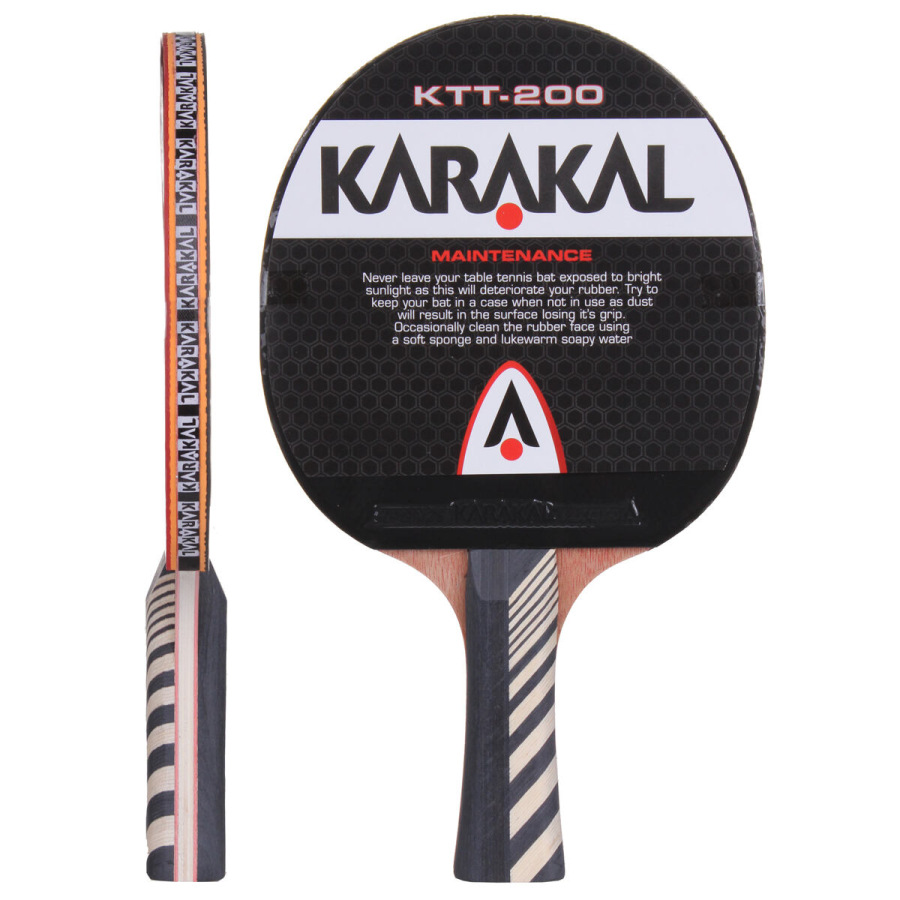 Karakal KTT-200 je štandardná dvouhvězdová raketa na stolný tenis vyrobená zo sedemvrstvového vŕbového dreva, ktoré výborne absorbuje silu a výrazne tak prispieva k obranným schopnostiam pálky. Hlava rakety je pre väčšiu kontrolu a lepšiu obranu potiahnutá 1,8 mm silnú hubou a gumovým poťahom Karakal Bronze 25A. Karakal KTT-200 je všestranná pálka, výborná pre ďalší výkonnostný rozvoj rekreačných hráčov a začiatočníkov. Raketa je vybavená obrysovým obalom na zips. Hmotnosť rakety je 190 gramov.