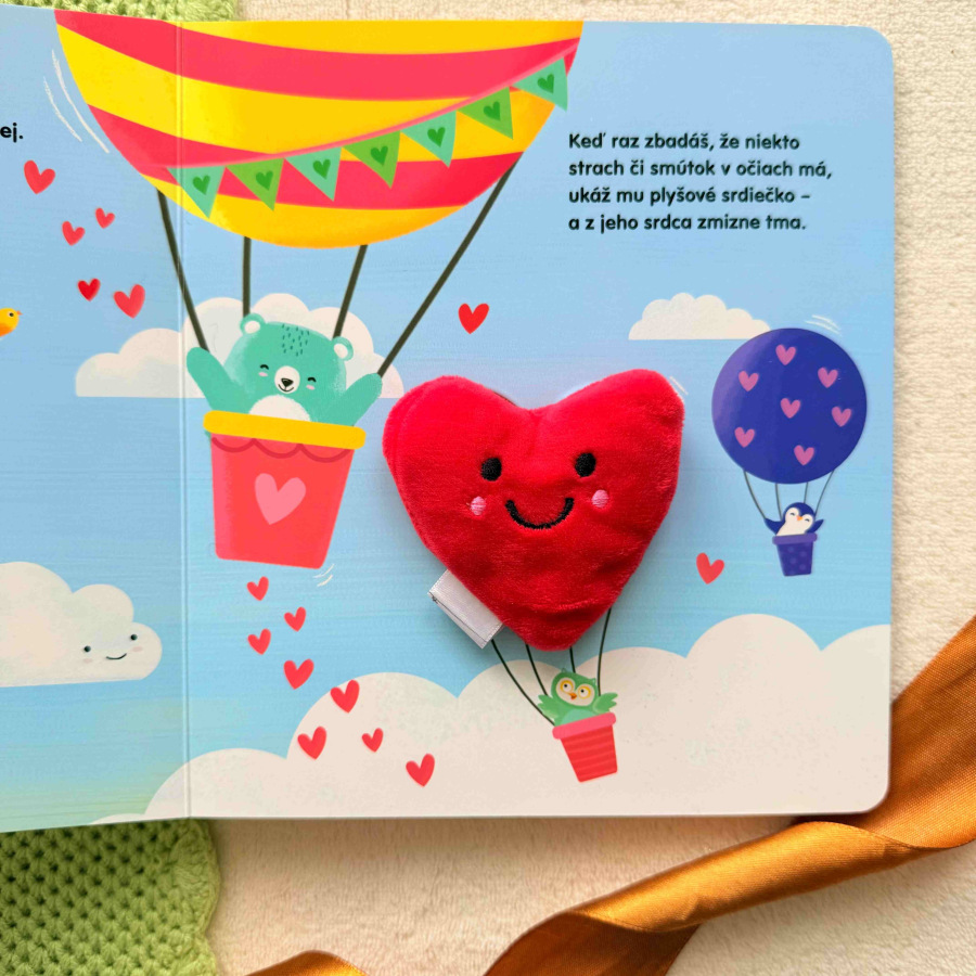 Aj malé ľudské bytosti majú svoje starosti – nesmelosť, strach z neznámeho, obavy z neprijatia. Táto unikátna publikácia v krátkych, citlivo formulovaných veršovačkách upokojuje deti a uisťuje ich, že v ťažkých chvíľach sa môžu obrátiť na spoľahlivého kamaráta – odnímateľné plyšové srdiečko, ktoré si môžu vziať so sebou kdekoľvek – do škôlky, k lekárovi alebo na akúkoľvek chvíľku odlúčenia. Plyšové srdiečko im pripomenie, ako veľmi sú ľúbené a že láska sa nachádza všade okolo – v úsmevoch, objatiach, milých slovách či maličkostiach.