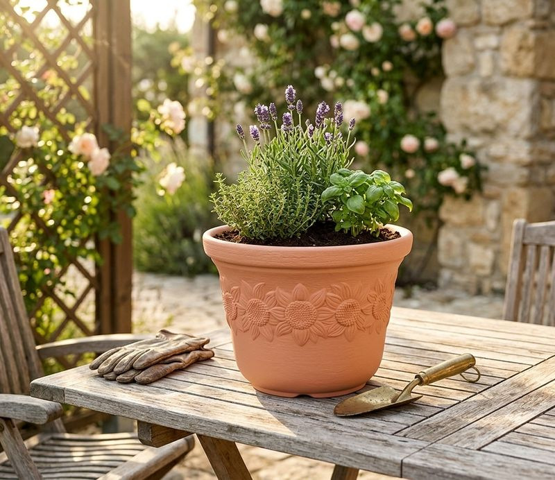 Klasický kvetináč Sunny s dekorom slnečníc v terakota farbe skrášli Váš dom. Rozmery: 30x22,5 cm.