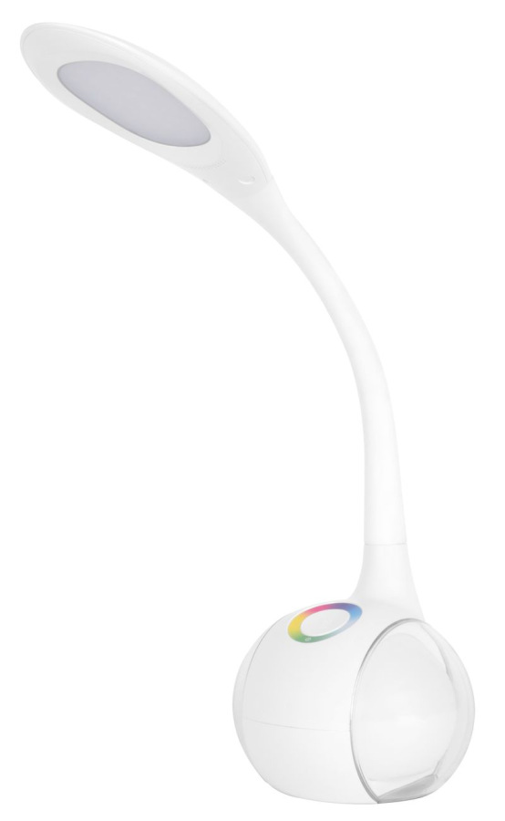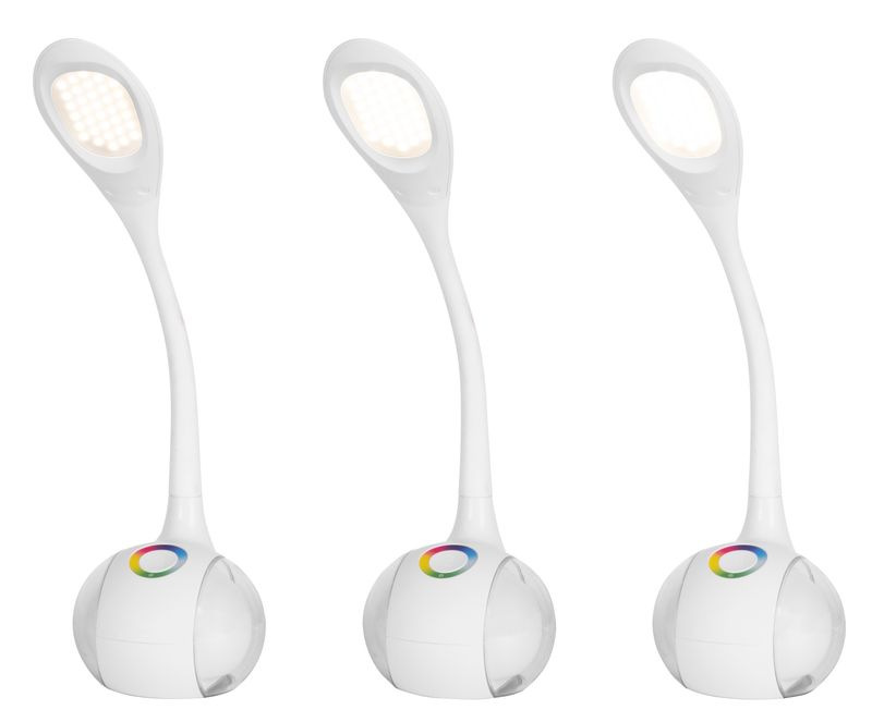 LED stolná lampička s atmosférickým podsvietením s až 256 farbami, z ktorých si môžete zvoliť ľubovoľnú farbu alebo režim automatického prelínania farieb. Lampa môže slúžiť aj ako nočné svetlo, je stmievateľná. Má dotykové spínanie, ohybné rameno a náklopnú hlavu. Farba: biely lesk. Rozmer: 540x160x130 mm.