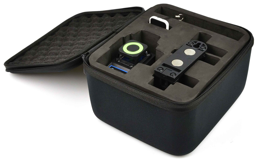 Sada obsahuje otočný stojan s 3 nastaviteľnými nosnými bodmi, magnetický držiak, diaľkové ovládanie, laserový terč a nabíjací kábel. Všetko zabalené v špeciálnom kufríku pre bezpečnú prepravu a skladovanie zariadenia.