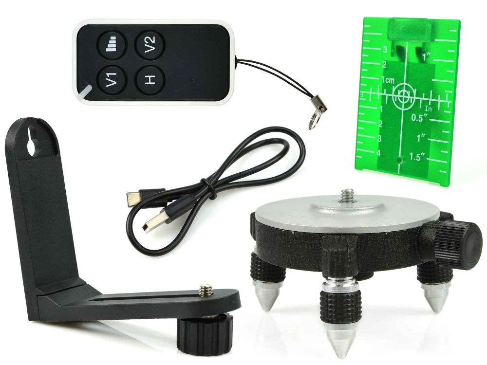 Obsahuje diaľkové ovládanie, otočný stojan s 3 nastaviteľnými opornými bodmi, magnetický držiak, laserový terč a nabíjací kábel