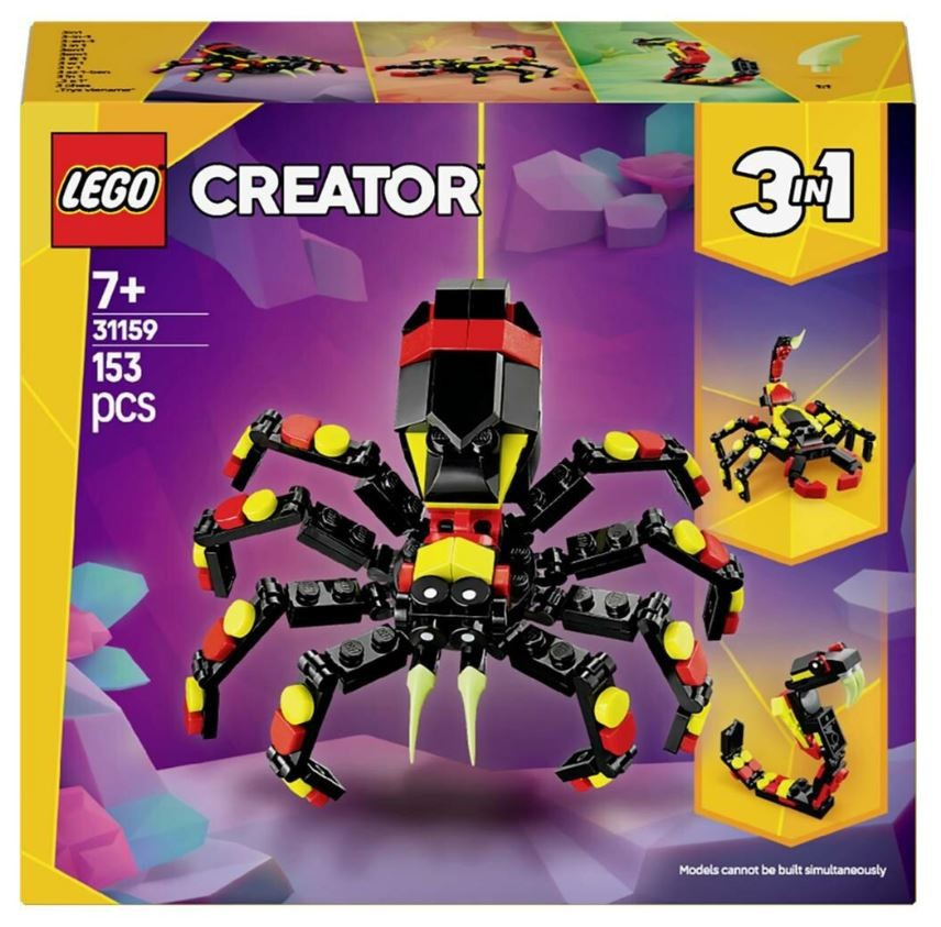 Stavebnica LEGO® Creator 3 v 1 Divoké zvieratá: Prekvapivý pavúk ponúka deťom možnosť postaviť si až tri rôzne modely – pavúka, škorpióna alebo hada. Všetky figúrky majú pohyblivé prvky na dynamickú hru a pavúka možno zavesiť pomocou žltej pavučiny na kocku LEGO®. Set obsahuje 153 dielikov a je skvelým darčekom pre tvorivé deti, ktoré milujú zvieratá a akčné dobrodružstvá.