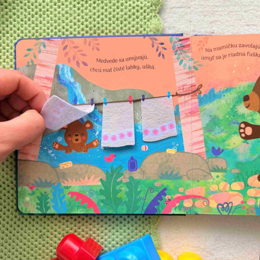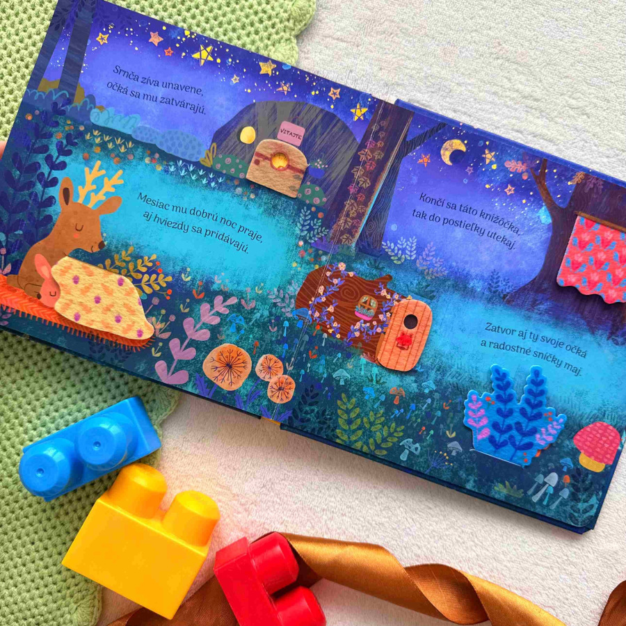 Keď les utíchne a hviezdy zažiaria na oblohe, začína sa príbeh o zvieratkách, ktoré sa chystajú spať. Myška ešte odkladá hračky, medvedíky si umývajú labky a veverička čaká na rozprávku na dobrú noc. Krásne ilustrovaná knižka s látkovými prvkami a milým rýmovaným príbehom pomôže deťom pri dodržiavaní večerných návykov – upratanie, kúpanie, čítanie príbehov – a samotnom zaspávaní.